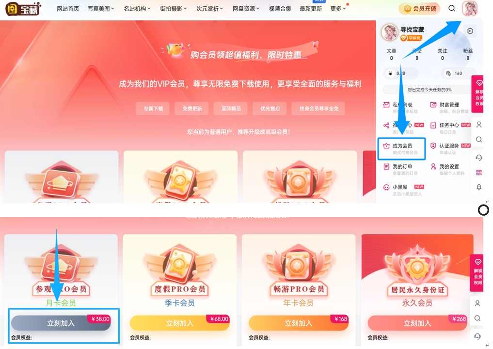 第二步:点击个人头像-【成为会员】-选择会员级别【立刻加入】