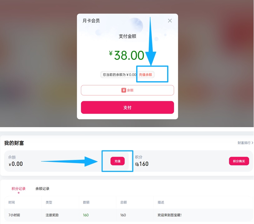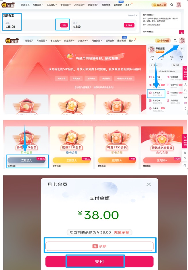 第五步:到个人界面【我的财富】已显示充值余额-点击【个人头像】-【成为会员】-选择【月卡会员】-【余额】-【支付】-【支付成功确定】-至此已完成会员购买!