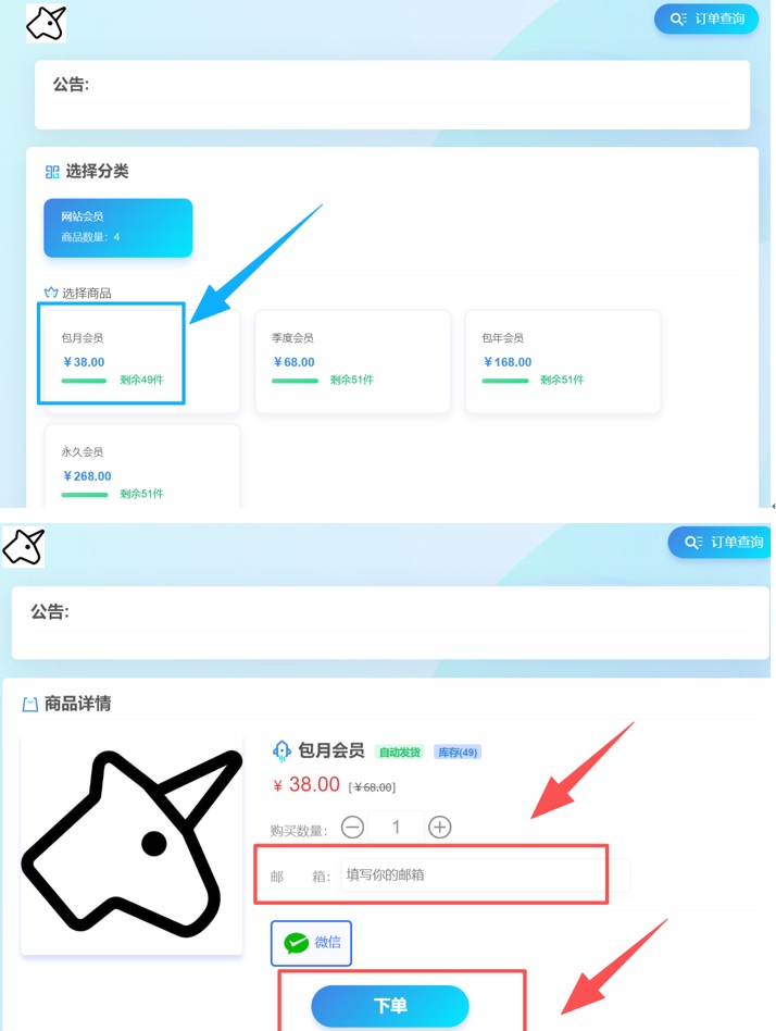 第三步:点击【充值余额】-【充值】-【卡密】-【购买卡密】-选择【包月会员】-【填写邮箱】-点击【下单】-【支付成功确定】
