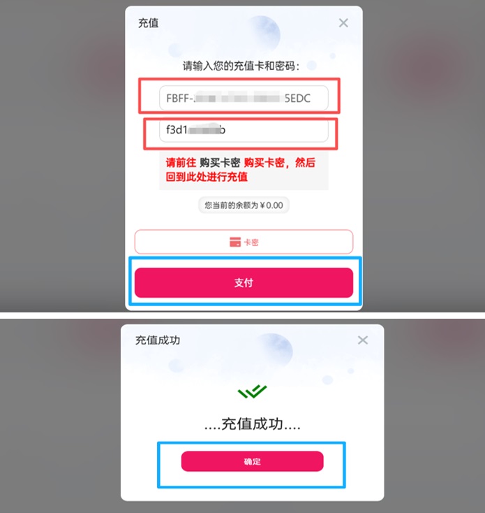 第四步:复制第一行卡号和第二行密码-返回【充值】-【卡密】页面-填上【卡号】和【密码】-点击【支付】-确定【充值成功】
